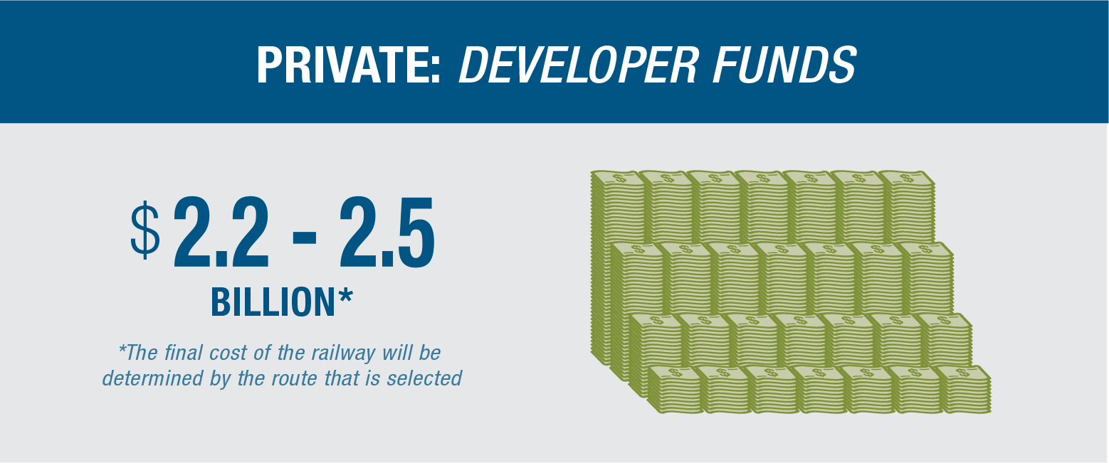 The private industry will pay an anticipated $2.2 - $2.5 billion for construction, operation and maintenance of the railway. This financing will be paid through contracts and service fees for use of the railway.